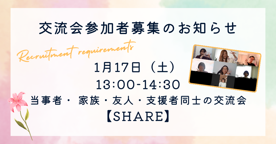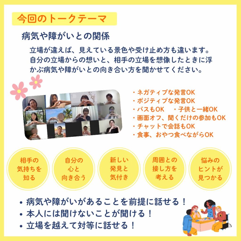 何かしらのご病気を抱える方の、患者と家族・友人・支援者、両者が交わる”オンライン”交流会です。