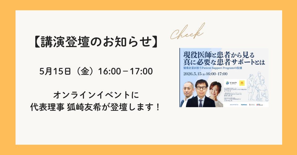 【講演登壇のお知らせ】5月15日(金)代表理事 狐崎友希がオンラインイベント「現役医師と患者から見る真に必要な患者サポートとは」に登壇します!