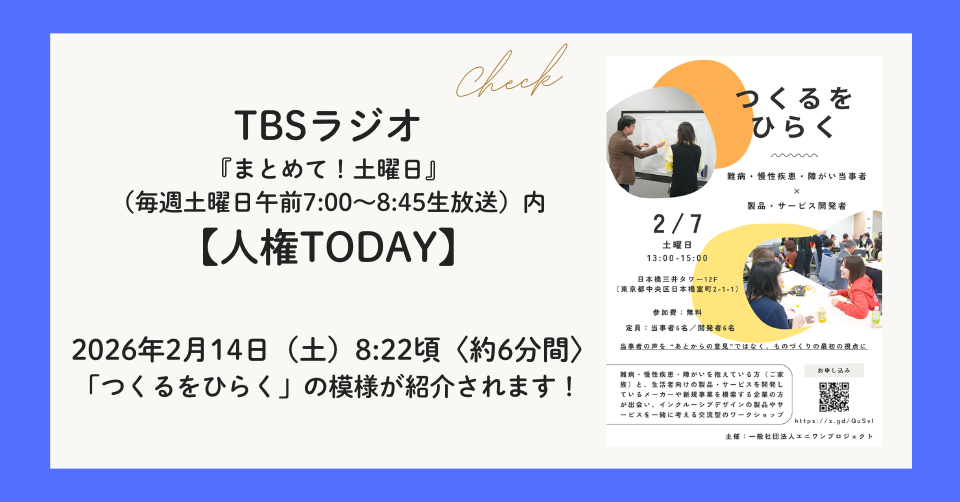 2026年2月7日(土)に開催された、難病や障がいを抱える当事者と開発者の交流型ワークショップ「つくるをひらく」の模様が、TBSラジオ『まとめて!土曜日』(毎週土曜日午前7:00~8:45生放送)内コーナー「人権TODAY」で紹介されます!!